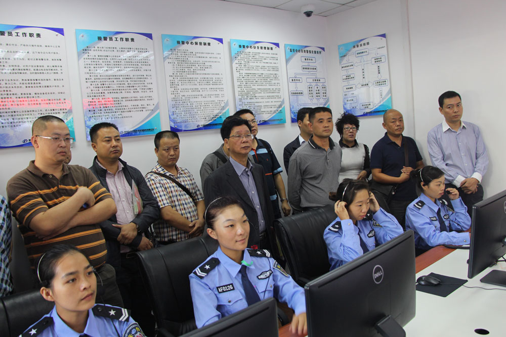 上图为:参加开业典礼的领导正在观看九游会老哥必备的交流社区安防系统运营服务有限公司的操作间。